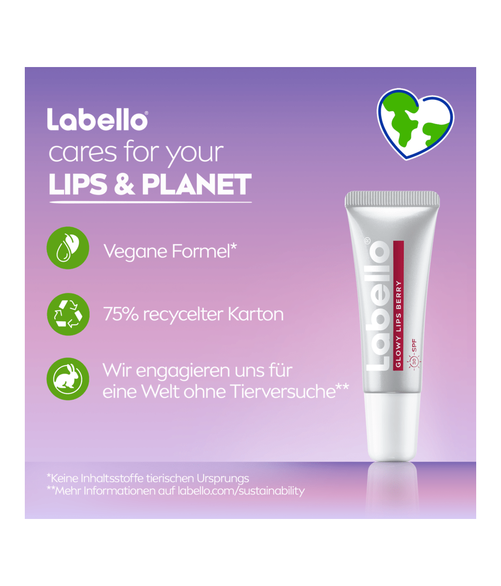 Labello® GLOWY LIPS verleiht deinen Lippen einen Hauch von Farbe und ein reichhaltiges, glänzendes Finish. Die ultra-hydratisierende Formel mit Hyaluronsäure, Vitamin E und Glycerin revitalisiert den natürlichen Glanz deiner Lippen und sorgt für langanhaltende Pflege. Dieser Lippenbalsam ist sanft zu jeder Lippenhaut und trocknet die Lippen nicht aus, sodass sie weich und geschmeidig bleiben. Zudem bietet Labello® GLOWY LIPS einen Lichtschutzfaktor (LSF) von 30, der deine Lippen vor schädlichen UV-Strahlen schützt. Ideal für den täglichen Gebrauch, um sichtbar strahlende und gepflegte Lippen zu erzielen, die sowohl schön als auch gesund aussehen.