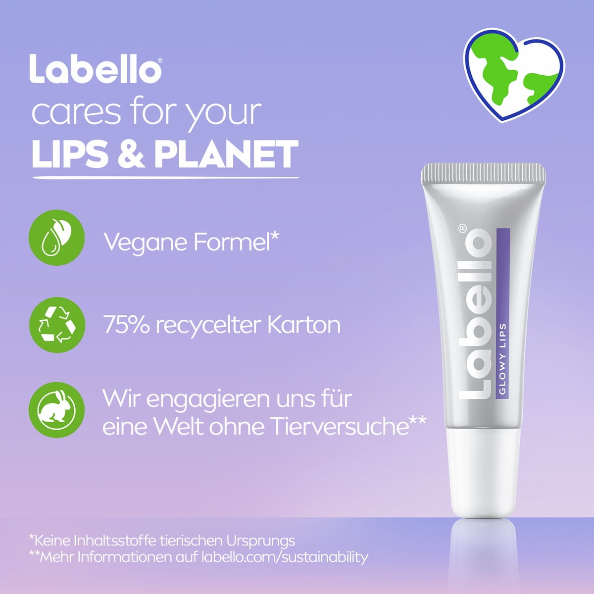 Der Labello Glowy Lips ist ein innovativer Lippenbalsam, der mit einer feuchtigkeitsspendenden Formel aus Hyaluron, Vitamin E und Glycerin angereichert ist. Diese Kombination, ergänzt durch Magnolienextrakt, sorgt für regenerierte und sichtbar strahlende Lippen. Die sanfte Formel trocknet die Lippen nicht aus und hinterlässt ein gepflegtes Gefühl, das sofort eintritt. Anwenderinnen berichten von einer Verbesserung trockener Lippen nach nur 8 Stunden und einer sofortigen Revitalisierung des natürlichen Glanzes. Der Balsam ist vegan und enthält keine tierischen Inhaltsstoffe. Verpackt in einer umweltfreundlichen Tube aus 75 % recyceltem Karton, ist Labello Glowy Lips nicht nur gut für die Lippen, sondern auch für die Umwelt. Dermatologisch getestet und hautverträglich, ist er ideal für alle Lippenhauttypen.