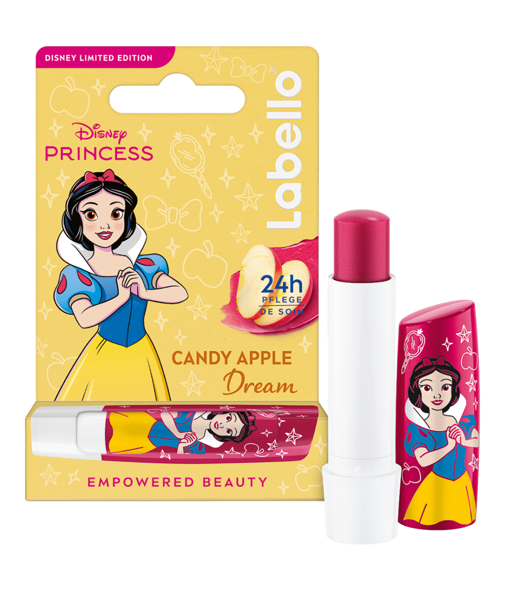 Tauche in die Welt der Disney Prinzessinnen ein mit den neuen Labello Limited Editions. Verwöhne deine Lippen mit Labello Candy Apple Dream der Limited Disney Princess Edition. Die Formel mit natürlichen Ölen und Apfelaroma spendet 24h Pflege und schützt sie vor dem Austrocknen - ganz ohne Mineralöle. Der Lippenpflegestift verleiht deinen Lippen ein zartrotes Finish und umhüllt sie mit dem frischen Duft von Äpfeln. Für frisch aussehende und spürbar gepflegte Lippen - den ganzen Tag.