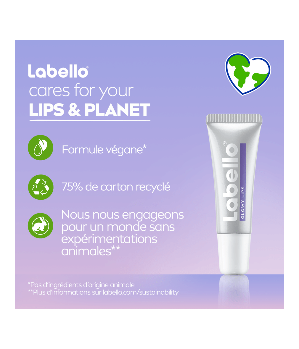 Labello Glowy Lips est un baume innovant pour les lèvres, doté d’une formule hydratante enrichie en Acide Hyaluronique, Vitamine E et Glycérine. Cette association complétée par de l’extrait de Magnolia, regénère les lèvres et les illumine. La formule douce ne dessèche pas les lèvres et leur procure une sensation instantanée de soin. Les utilisatrices constatent que les lèvres sont moins sèches après seulement 8 heures et qu’elles retrouvent immédiatement leur brillance naturelle. Le baume est végane et ne contient aucun ingrédient d'origine animale. Conditionné dans un tube écologique en carton recyclé à 75 %, Labello Glowy Lips est non seulement bon pour les lèvres, mais aussi pour l'environnement. Testé dermatologiquement et hypoallergénique, il convient à tous les types de lèvres.